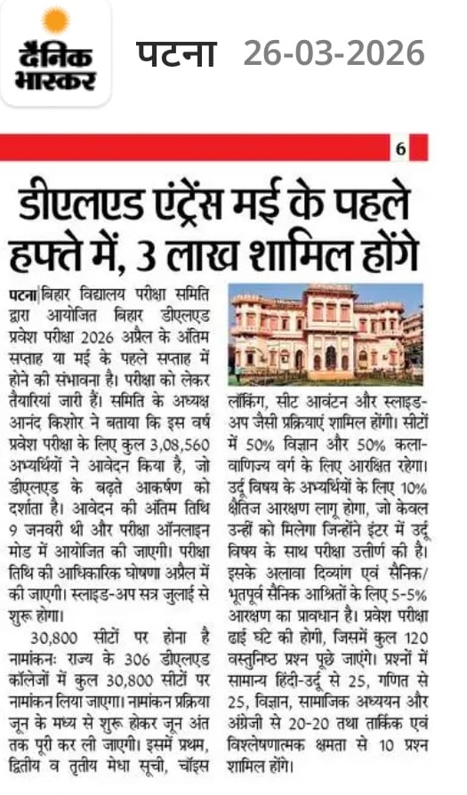क्या आप भी जानना चाहते हैं कि बिहार डीएलएड प्रवेश परीक्षा 2026 का आयोजन कब से शुरू होगा तो आप इस आर्टिकल में अंत तक बन रहे, क्योंकि इस आर्टिकल के माध्यम से बिहार डीएलएड एंट्रेंस एग्जाम 2026 के बारे में संपूर्ण जानकारी बताई जाएगी।